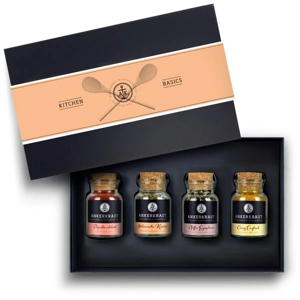 Manchmal steht man einfach auf dem Schlauch wenn es um Geschenke geht. Das will Ankerkraut nicht und bietet deshalb Geschenksets zu allen passenden Anlässen fertig verpackt an. Wie zum Beispiel das Set “Kitchen Basics” mit 4 Korkengläsern, welches die Küche des Beschenkten einmal grundausstatten möchte. Besonders zur Einweihung der neuen Wohnung oder der neuen Küche passt dieses Set wie die Faust auf’s Auge. Es kommt in einem festen Karton, der mit edlem schwarzen Papier bezogen ist. Den letzten Schliff bekommt das Geschenkset durch eine Banderole.Art.-Nr.: 1546936