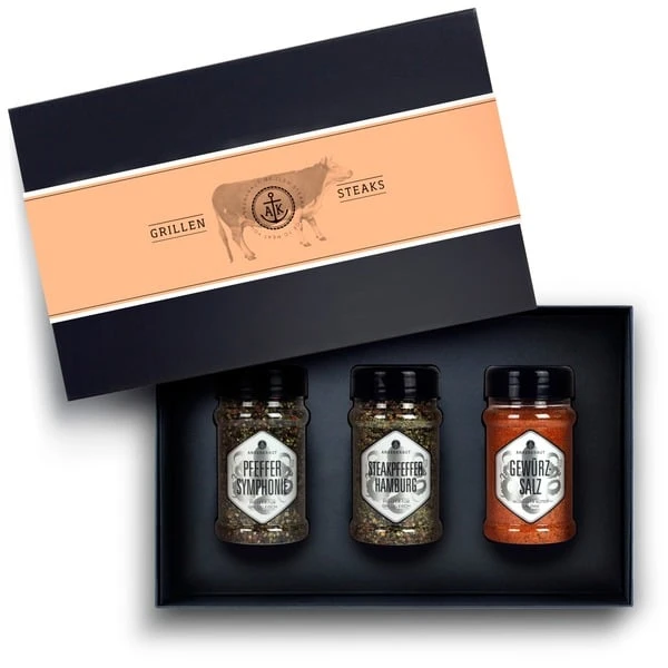Eine Kunst die jeder beherrschen möchte: Das perfekte Steak grillen. Zum Learning by Doing oder zum Optimieren der bereits vorhandenen Künste gibt es von Ankerkraut das Geschenkset “Steaks Grillen” mit den 3 wichtigsten Gewürzen im Streuer, die danach schreien dem perfekt gegrillten Steak das gewisse Etwas zu verpassen. Das Set wird sogar fertig eingepackt geliefert, so dass man nur noch drauf los schenken muss. Es kommt in einem festen Karton, der mit edlem schwarzen Papier bezogen ist. Den letzten Schliff bekommt das Geschenkset durch eine Banderole.Art.-Nr.: 1546968
