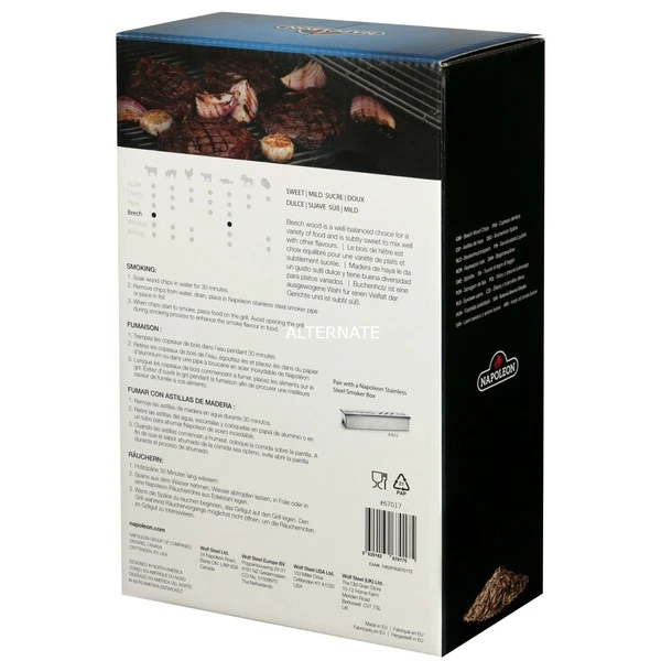 Die Napoleon Buchenholz Räucherchips 67017 verleihen dem Grillgut ein mildes Rauch-Aroma. Für das optimale Aroma legt man die Räucherchips mindestens 30 Minuten vor der Verwendung in Wasser, Apfelsaft, Ale, Wein oder Most, Chardonnay, Pinot Noir oder Ananassaft ein. Dann nimmt man die Räucherchips aus der Flüssigkeit, füllt sie in die Napoleon Räucherpfeife und platziert diese über den Flammenschutzeinsätzen. Man kann die Räucherchips auch direkt in den integrierten Räuchereinsatz des Prestige PRO665RSIB füllen oder auf den glühenden Kohlen im Apollo Smoker AS300K oder AS200K platzieren. Wenn die Chips zu rauchen beginnen, legt man das Grillgut auf und schließt den Grilldeckel.Art.-Nr.: 1591759