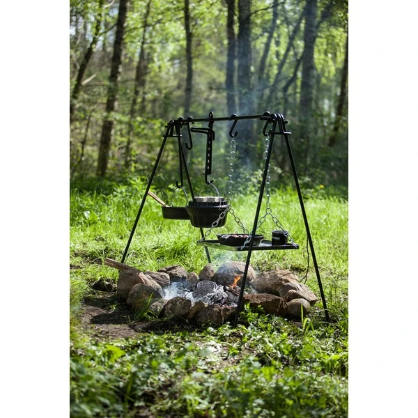 | Weitere Informationen | Die praktische Kochstelle wird mit einer 115cm langen Querstange, einem Grillrost mitsamt höhenverstellbarer Kettenaufhängung sowie drei Haken unterschiedlicher Länge für das Anhängen von Kochgeschirr geliefert. Die lange Querstange ermöglicht das Kochen über einer oder mehreren Feuerstellen. Der Grillrost mit umlaufend erhöhtem Rand hält das Grillgut sowie Pfannen und Co. sicher an ihrem Platz. | ||