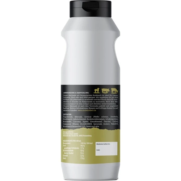 #Schwarzerknobi steht für eine einzigartig leckere Knoblauchmarinade, die Grillspezialitäten eine besondere Note gibt. Ob Fleisch, Fisch, Gemüse oder vegane Speisen, mit dieser Marinade hat man noch mehr Möglichkeiten auf dem Grill. Mit flüssigen Marinaden bringt man noch mehr Geschmack an das Grillgut und es ist eine ideale Alternative für Trockenrubs. Die leckere Marina harmoniert z.B. herrlich mit Ribs, Pulled Pork oder klassischen Nackensteaks. Die SizzleBrothers Marinade kommt in der praktischen und wiederverschließbaren 500 ml Flasche und eignet sich zum Marinieren von ca. 5 kg Grillfleisch.Art.-Nr.: 1658856